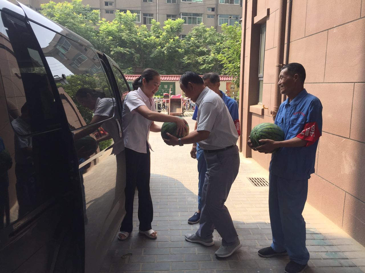 当日上午,总经理赵明海、工会主席常红艳等人一行来到河南街、安谷苑、九冶、城投时代进行慰问,向一线职工送去800余斤西瓜。慰问组每到一处,亲切询问保安保洁的生活情况和工作状况,叮嘱他们要注意防暑降温,并对保安保洁近期以来的勤恳劳动表示感激和关怀之情,叮嘱他们在开展“创文”整治工作以来,保洁员队伍人员少、天气热、任务重的情况下,在提高小区环境质量的同时,要做好遮阳等保护措施,注意劳逸结合,预防中暑。