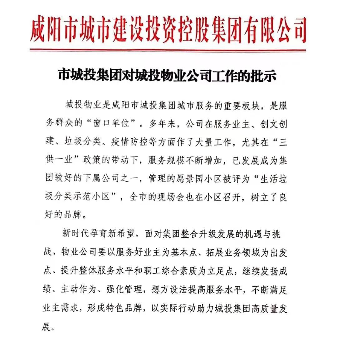 会议开始前,王雅玲宣读《市城投集团对城投物业公司工作的批示》。批示中指出,多年来,城投物业在服务业主、创文创建、垃圾分类、疫情防控等方面作了大量的工作,尤其在“三供一业”政策的带动下,服务规模不断增加,已成为集团较好的下属公司之一,树立了良好的品牌。希望城投物业在今后的工作中,继续发扬成绩、主动作为、强化管理,想方设法提高服务水平,以实际行动助力城投集团高质量发展。